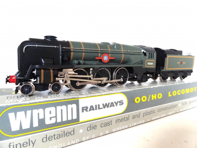 This is the RARE Wrenn W2238 "Clanline" 4-6-2 Merchant Navy Class Locomotive in BR Green. Running number 35028, with brass "ETCHED PLATES" not the more common paper version. Has seen minimal layout use in my opinion.